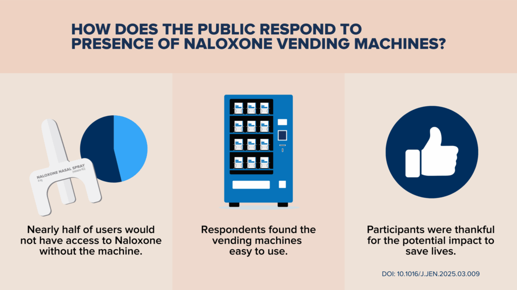 Dahlem, C. H. G., English, E., Dwan, M., Carlson, C., Dora-Laskey, A., Kocher, K. E., & Losman, E. D. (2025). Implementation of a Naloxone Vending Machine in the Public Space of an Emergency Department: A Feasibility and Acceptability Study. Journal of emergency nursing, S0099-1767(25)00095-9. Advance online publication. https://doi.org/10.1016/j.jen.2025.03.009