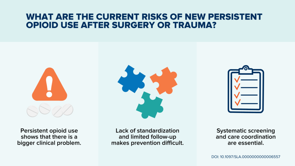 - Despite the growing awareness of new persistent opioid use as a potential complication after surgery, several gaps exist regarding our knowledge of the long-term consequences of the condition.