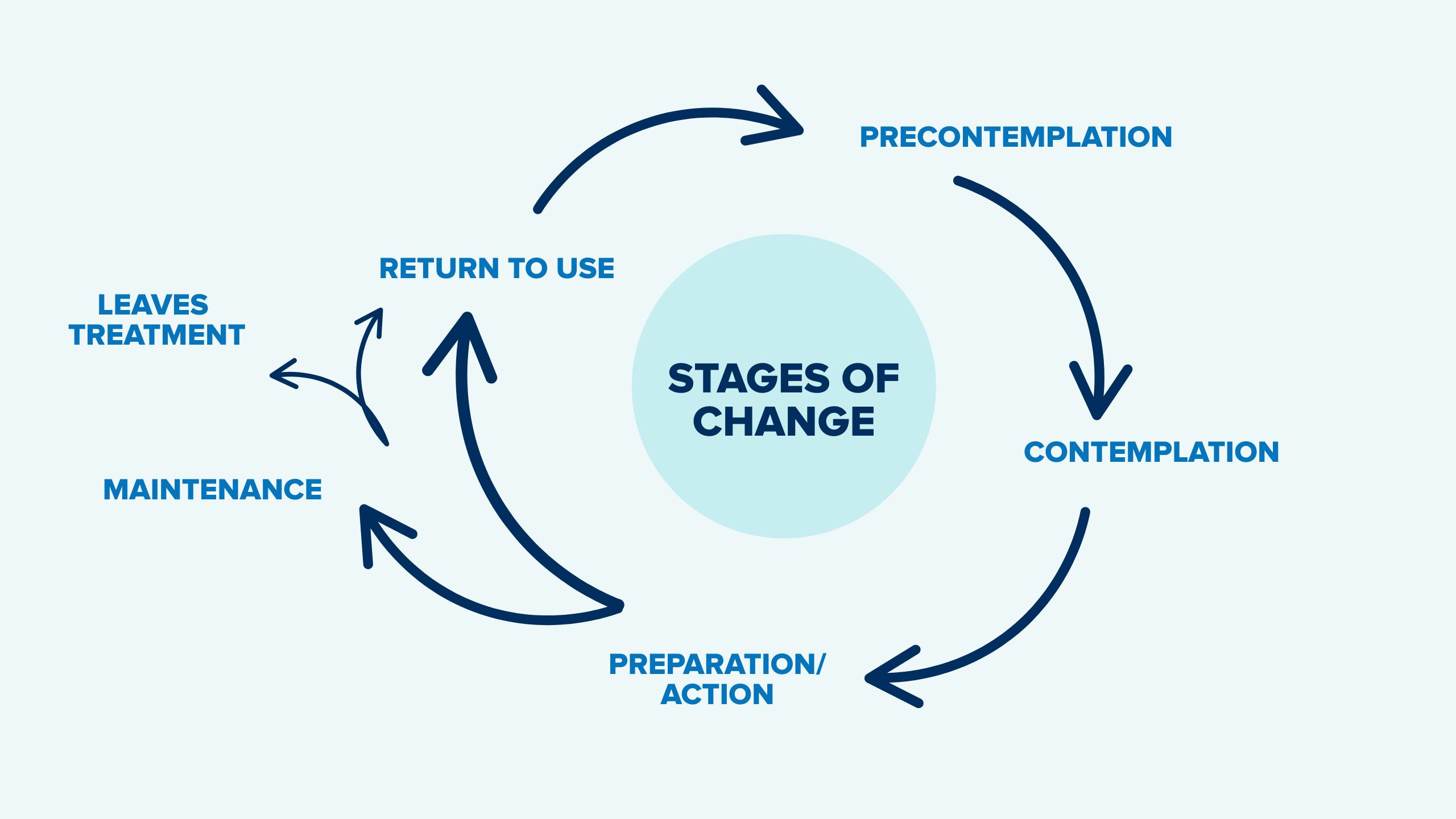 | Return to Use | Return to use is not considered a separate stage but a part of the process. It refers to returning to old behaviors after a period of change. This is common and can happen at any stage. The key is to use the experience as a learning opportunity and continue moving forward. The goal for the PCP is to provide support, explore the rationale for return to use, and assist them in developing strategies to get back on track. For example, maybe the person’s medication for opioid use disorder wasn’t at the appropriate dose or they were not able to get to their next appointment for a refill. |